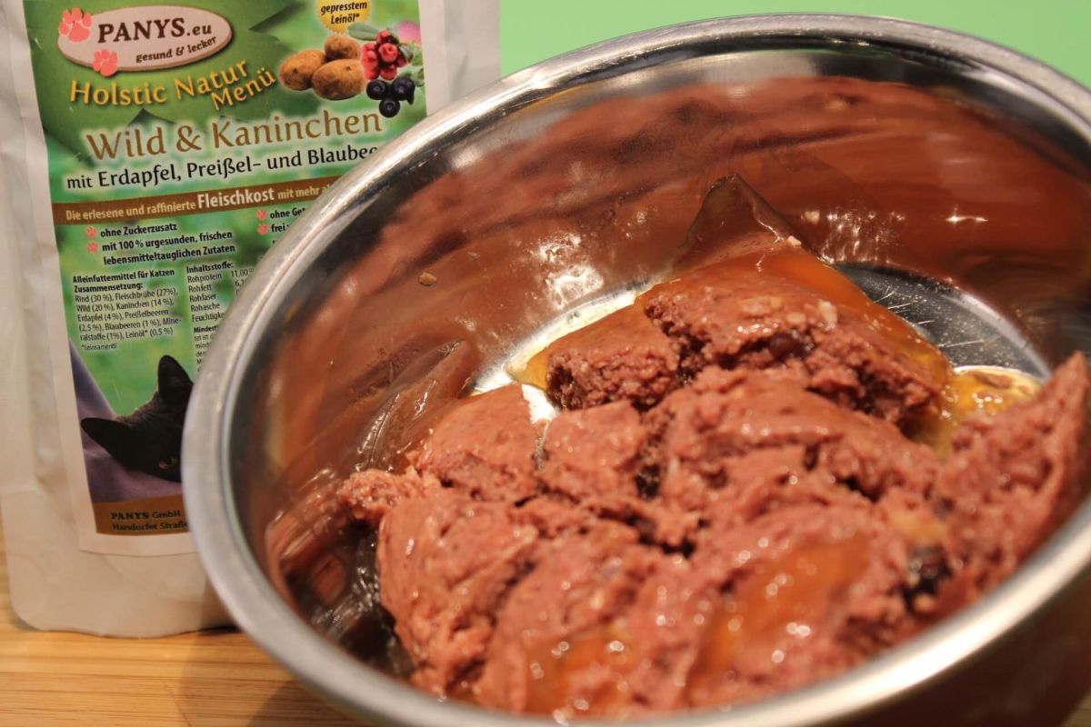 Alleinfuttermittel für ausgewachsene Katzen mit 64,0 % Fleischanteil vom Rind, Wild und Kaninchen. Super geeignet für alle die kein Geflügel vertragen. Nur 4,0 % Kohlenhydrate in Form von Erdäpfeln. Bei diesem Menü handelt es sich um eine getreidefreie und glutenfreie Rezeptur. 2,5 % Preiselbeeren und 1,0 % Blaubeeren sind reich an Vitaminen und ideal als Antioxidantien, man sollte davon nicht zu viel geben, daher haben wir uns auf insgesamt 3,5 % beschränkt. Die Beeren haben sehr wenig Fruchtzucker und sie unterstützen das Immunsystem.