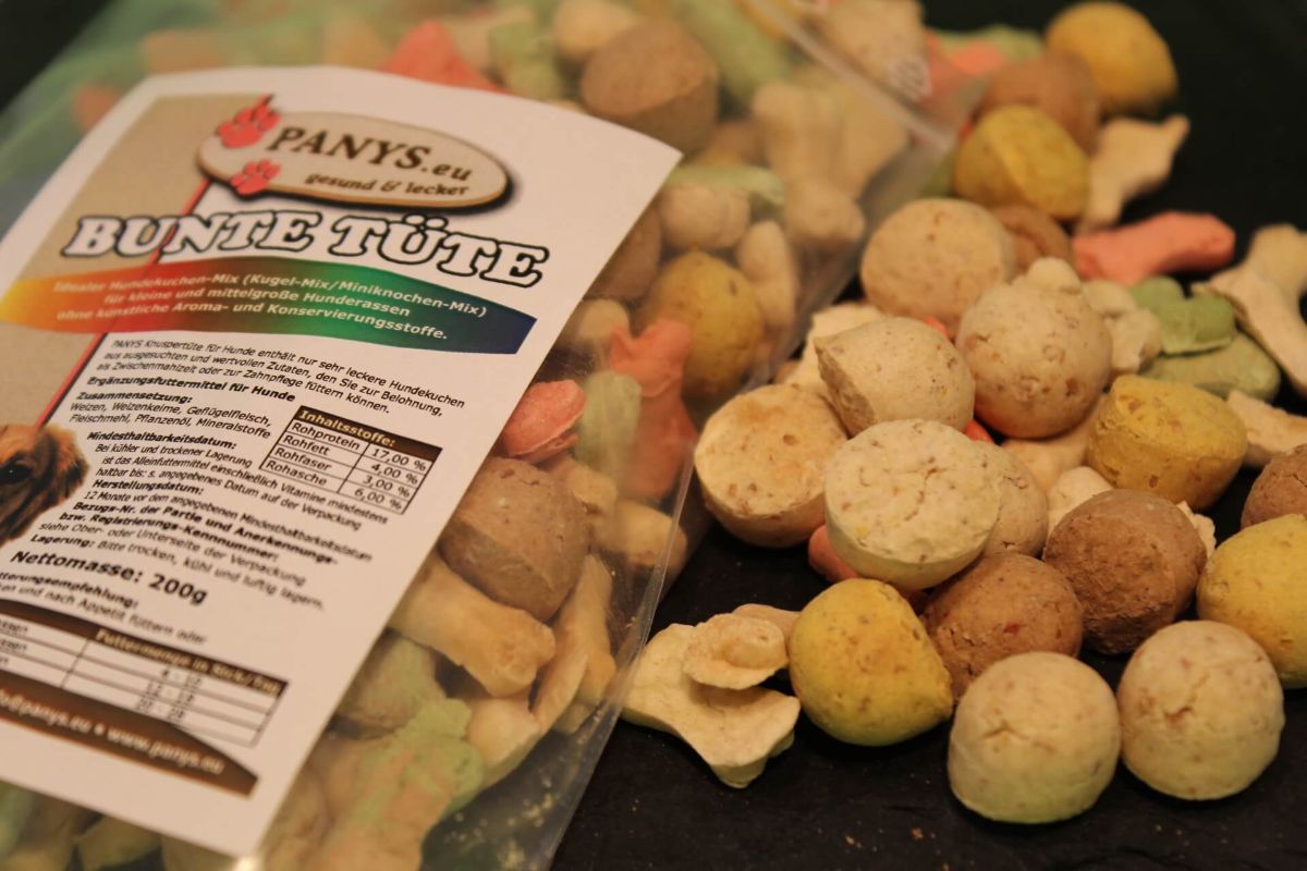 Bunte Tüte Idealer Hundekuchen Mix aus (Kugel-Mix und Miniknochen-Mix) für kleine und mittelgroße Hunderassen, ohne künstliche Aroma-, Farb- und Konservierungsstoffe. Die Hundekuchen eignen sich auch gut für Hundespiele da sie nicht fetten. Wir wünschen ihrem Liebling guten Appetit! Ein zufriedener, glücklicher Hund liegt uns doch allen am Herzen. PANYS Bunte Tüte gibt es im praktischen wieder erschließbaren 200g Beutel. Sollten Sie und Ihr Liebling von der PANYS Bunte Tüte begeistert sein, können Sie diese auch im 500g Beutel oder 4,0kg Sack bestellen.
