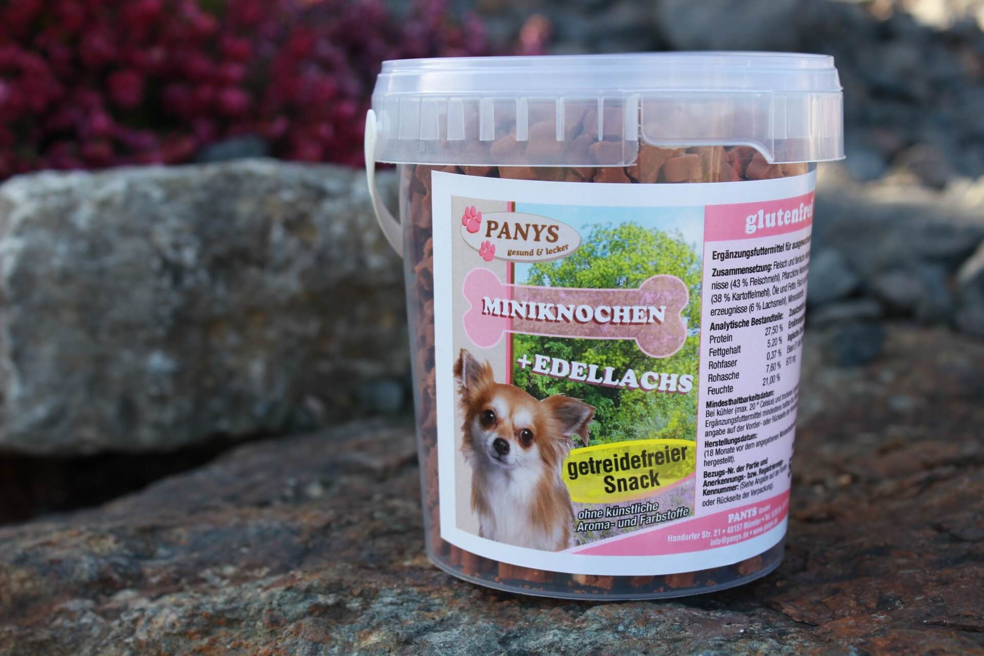 Klein und weich ! Wir halten für Ihre Lieblinge Leckerchen in bester PANYS Qualität bereit. Ein Highlight unter den Leckerchen, sind die PANYS Miniknochen + Edellachs. Wir haben auf Lockstoffe wie Zucker oder Nikotin verzichtet. "Ausgewogen und lecker" ist unser Motto ! Auch beim Training sollte Ihr Liebling nicht auf Leckerchen verzichten müssen. PANYS Leckerchen sind klein, weich und fetten nicht. PANYS Miniknochen sind für alle Hunde, unabhängig von Alter und Größe, optimal geeignet. Alle Miniknochen werden auf Fleisch- & Kartoffelbasis hergestellt und sind daher getreide- und glutenfreie Rezepturen. Natürlich sind alle PANYS Miniknochen auch ohne künstliche Aroma- und Farbstoffe. Damit das Training noch mehr Spaß macht, haben wir bei den Leckerchen mit neun verschiedenen Geschmacksrichtungen für Abwechslung gesorgt. Wir wünschen Ihrem Liebling guten Appetit und viel Spaß bei Training. Ein zufriedenes, glückliches Tier ist doch das, was uns allen am Herzen liegt. Die einzige Frage die sich hier stellt: „Welche Geschmacksrichtung mag mein Liebling am liebsten?“ Bei neun verschiedenen Geschmacksrichtungen fällt die Wahl oft schwer. Dafür haben wir die Miniknochen in 150 g Beutel verpackt. So hat Ihr Liebling die Möglichkeit alle Sorten einmal auszuprobieren. Wenn Sie wissen, welche Sorten bevorzugt werden, empfehlen wir die 500 g im wieder verschließbaren Eimer.